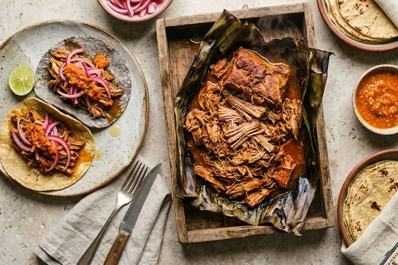 Una vez marinada, la carne se envuelve en hojas de plátano, un elemento que va más allá de lo estético. Durante la cocción, estas hojas funcionan como una barrera que retiene humedad y aporta un aroma vegetal distintivo. Tradicionalmente, la cochinita se cocina en un «pib», un horno subterráneo, pero en versiones caseras el horno convencional cumple bien la función si se respeta la cocción lenta y prolongada.