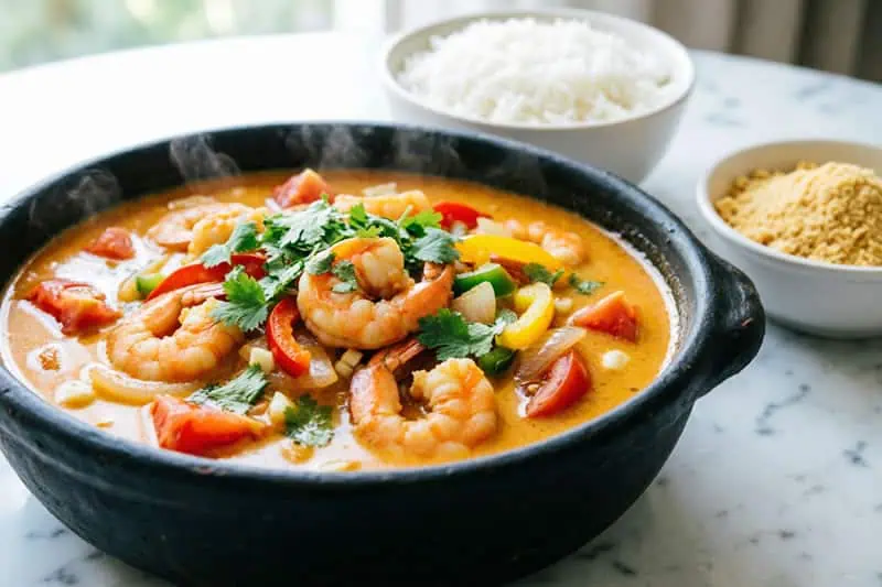 Un guiso costero de Brasil, cremoso y fragante, donde el camarón se cocina suavemente en leche de coco con jitomate, pimientos y un toque de aceite de palma. Es intenso, fresco y listo en poco tiempo.